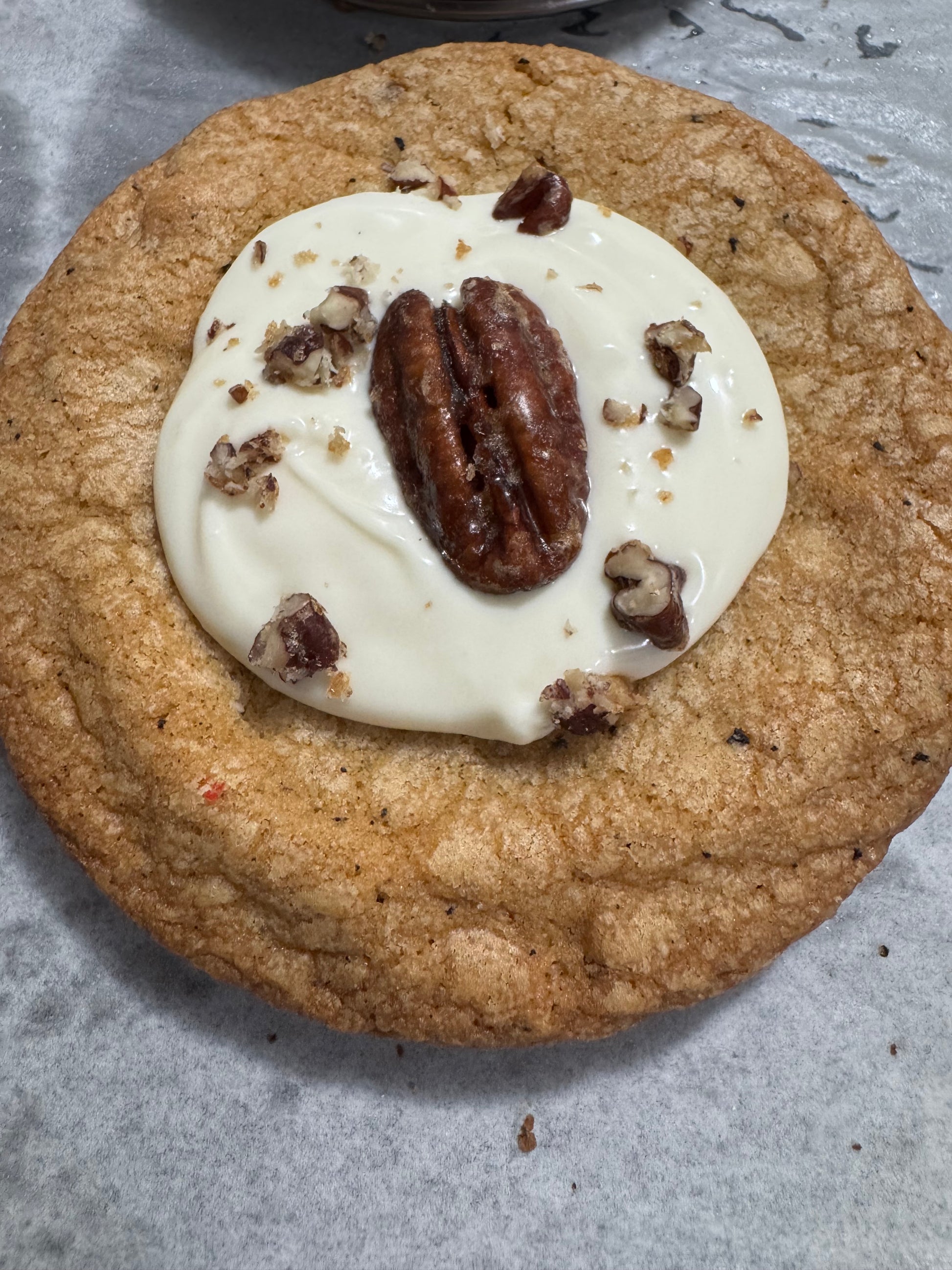 Indulge in our 5.5-ounce Brown Butter Cookie, crafted with rich, nutty brown butter and filled with homemade toasted pecans in every bite. Topped with creamy white chocolate and finished with a whole pecan on top, this decadent cookie delivers the perfect balance of warmth, crunch, and sweetness. Best enjoyed alongside your favorite warm holiday drink, it’s a seasonal treat you won’t want to miss